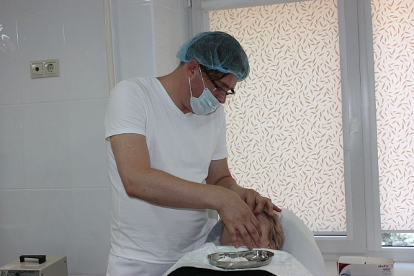 Пластический хирург Сергей Прокудин![]() Стаж Сергея Владимировича Прокудина — 17 лет, из них 14 лет он занимается непосредственно пластической хирургией. Опыт, полученный из общехирургической практики, доктор считает хорошей школой. «Мы делали все — и трепанации, и сердце шили, и грыжи удаляли, — делится он с корреспондентом и добавляет, — хороший хирург должен уметь все». Мать Сергея Прокудина — химик, отец — военный. «Я до сих пор даже не пойму, как я врачом стал. Это была мамина мечта, наверное. Но я ни о чем не жалею, мне нравится моя работа». В кабинете пластического хирурга![]() Пластической хирургией Сергей Владимирович занимается с большим энтузиазмом. Она давно стала неотъемлемой частью его жизни. «Скучать не приходится. Я приобрел много друзей, постоянно общаюсь с коллегами, делюсь своими успехами и узнаю много нового от них». Консультация по поводу отопластики![]() Рабочий день Сергея Прокудина начался с консультации. На прием к доктору пришла Пациентка Елена![]() Вторая пациента доктора Прокудина — Елена. После ДТП у женщины рассечение в области брови. В травмпункте рану зашили так, что образовалась большая ямка. Пришлось делать повторную операцию. К пластическому хирургу Елена пришла с просьбой устранить по возможности визуализацию рубца. Обезболивание участка под бровью![]() Медсестра провела Елену в процедурный кабинет и подготовила к лазерной шлифовке рубца. Перед процедурой пациентке нанесли анестезирующий крем, который снизит чувствительность. Благодаря этому лазерная шлифовка пройдет безболезненно и в максимально комфортных для Елены условиях. Лазерная шлифовка рубца![]() Лазерную шлифовку рубца проводит лично Сергей Владимирович Прокудин. Медсестра![]() А вот и медсестра, которая помогала хирургу. Фиксирующая повязка на нос![]() Из процедурной, где доктор Прокудин проводил лазерную шлифовку, хирург возвращается в свой кабинет и принимает очередную пациентку. Ей около 50 лет, свое лицо она скрывает, так как не хочет афишировать факт проведения пластических операций. А их у нее было аж 2. Первая операция закончилась неудачно — после ринопластики пациентка перестала дышать. Переделывать нос она пришла уже к доктору Прокудину. Сергей Владимирович сменил пациентке фиксирующую повязку. Женщина призналась, что лет 10 назад приходила к доктору Прокудину на консультацию, но, посчитав его слишком молодым, просто-напросто убежала и не стала оперироваться. «Сегодня, — говорит она, — доктор вырос в профессиональном плане, но внешне совсем не изменился — такой же молодой и красивый». Плановый послеоперационный осмотр![]() Рабочий день продолжается. В кабинет буквально вспорхнула молодая женщина лет 30 (это потом доктор признается, что ей 45). Она показывает хирургу свою грудь и жалуется, что одну как будто «намяли», зато другая «как родная». Сергей Владимирович успокаивает ее, мотивируя ситуацию естественным процессом восстановления, ведь после операции прошло немного времени, и одновременно журит за то, что пациентка не носит бюстгальтер! «Новая грудь»![]() Пациентка обещает впредь соблюдать все рекомендации и предписания доктора. И, поблагодарив хирурга за результат, упархивает из кабинета.